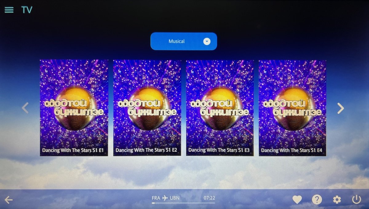 MIAT Mongolian Airlines’ 787 entertainment system is… strange. The seat back entertainment monitor has a variety of movies and TV shows, though none in English.