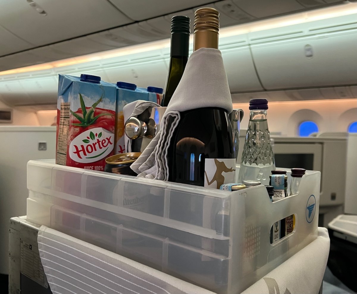 Drinks started to be served off a cart around 65 minutes after takeoff. The drink options were basic — think one red wine, one white wine, one sparkling wine, and a very limited liquor selection.