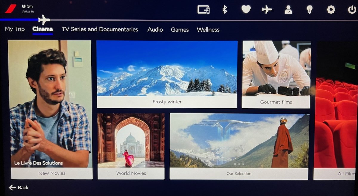 Air France’s A350 business class entertainment system is phenomenal — the screen is high definition, the interface is easy to use, and there are all kinds of cool features.