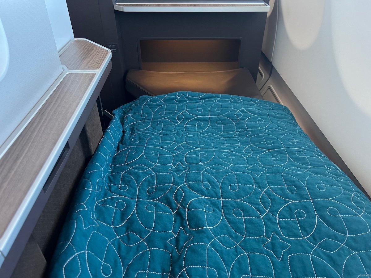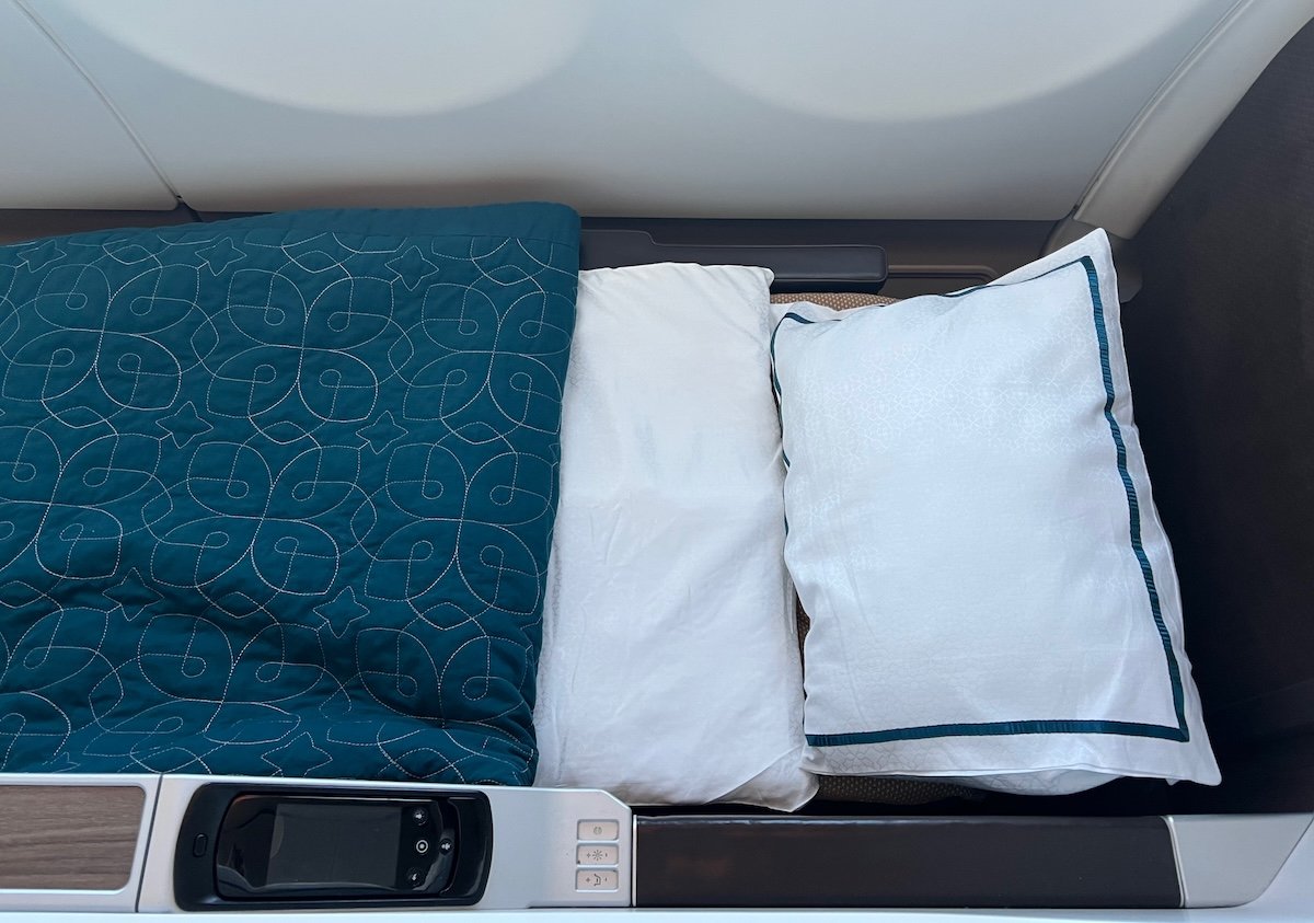 There were some highs and lows when it came to the amenities on this flight. On the plus side, this flight had the full Oman Air bedding setup, including a pillow, blanket, and mattress pad. Oman Air’s bedding is excellent, and makes it super easy to get comfortable.