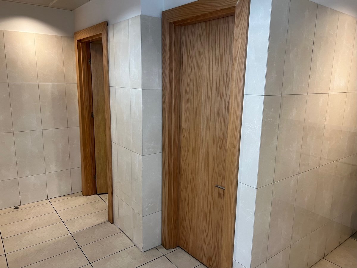 The Lufthansa Lounge New York JFK has bathrooms in the very back left of the lounge. The men’s room had two sinks, two stalls, and three urinals.