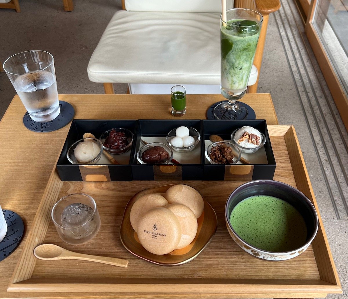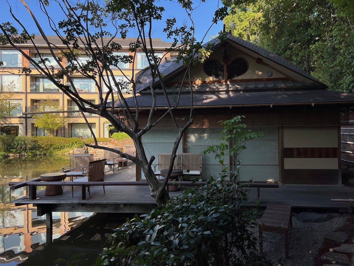 The Four Seasons Kyoto makes the most of its pond garden space, as the hotel has Fuju Tea Garden, open daily from 2PM until 7PM. This is located across the glass bridge and down the path, and it leads to a cute little house with both indoor and outdoor seating.