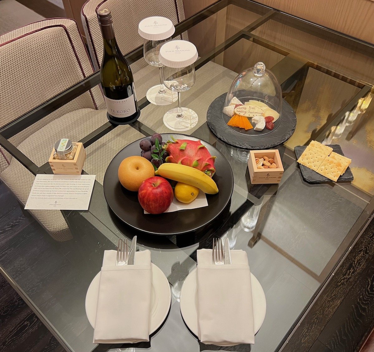 Waiting on the dining table was a lovely welcome amenity, consisting of some fruit, cheese, and nuts, plus a bottle of white wine.