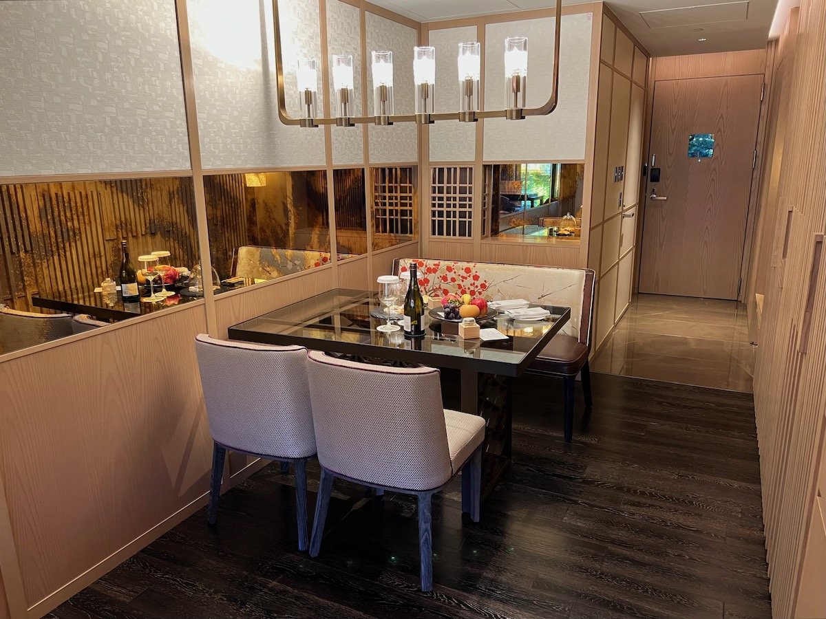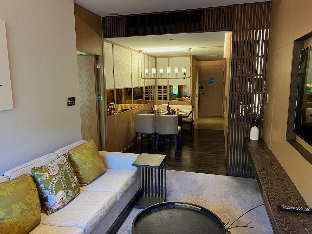 Executive suites at the Four Seasons Kyoto are marketed as being 71-76 square meters (764-818 square feet), so they’re quite generously sized. Inside the entrance to the suite was the living room, which contained a proper dining area, a living area, and a desk.