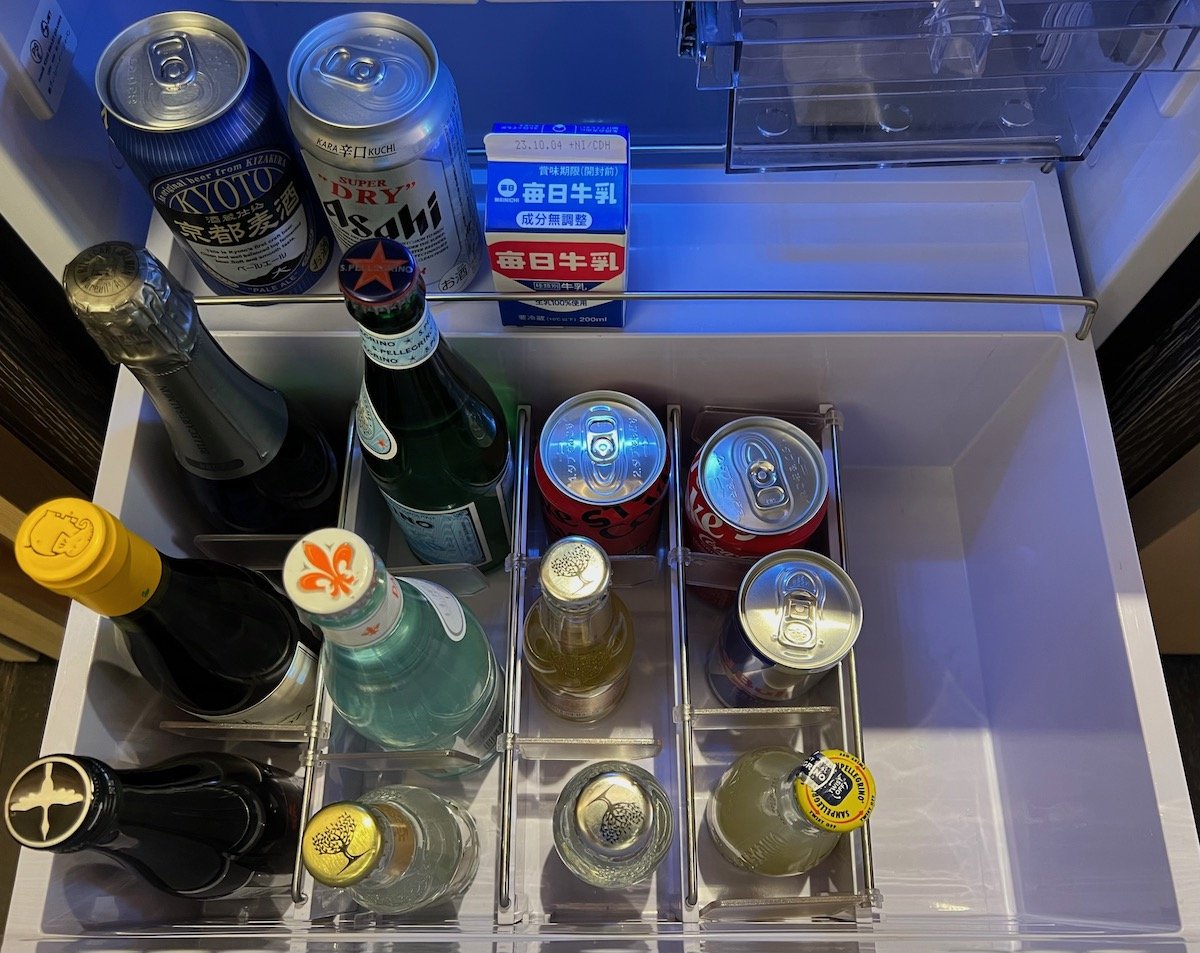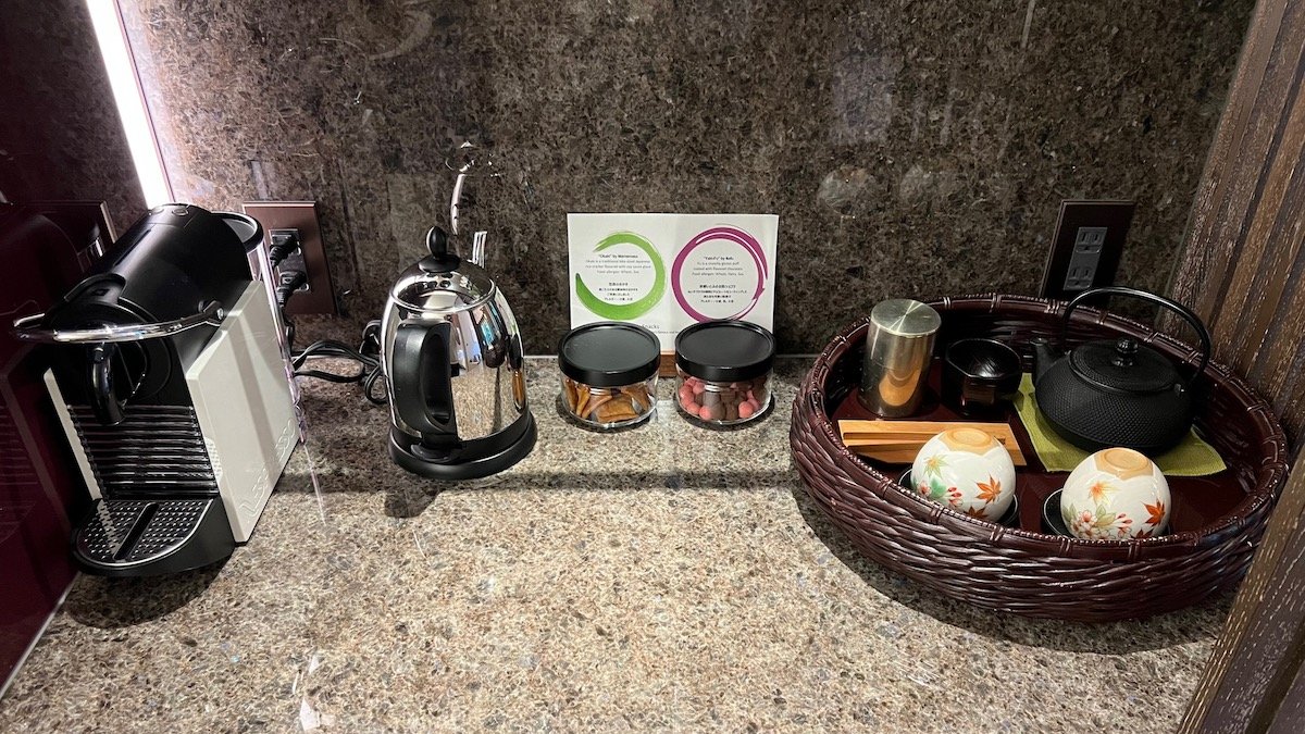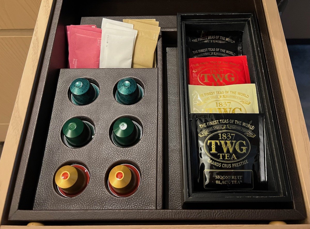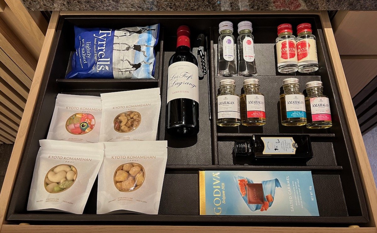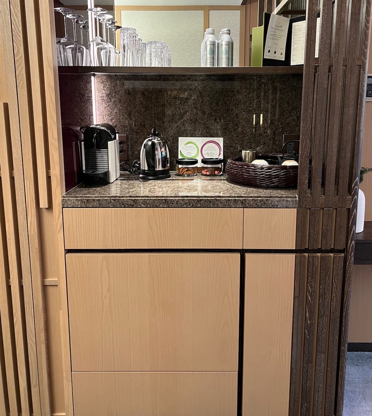 The minibar was back toward the entrance, and contained a complimentary selection of coffee and tea, plus some free snacks in glass jars. On top of that, there were additional drinks and snacks for purchase.