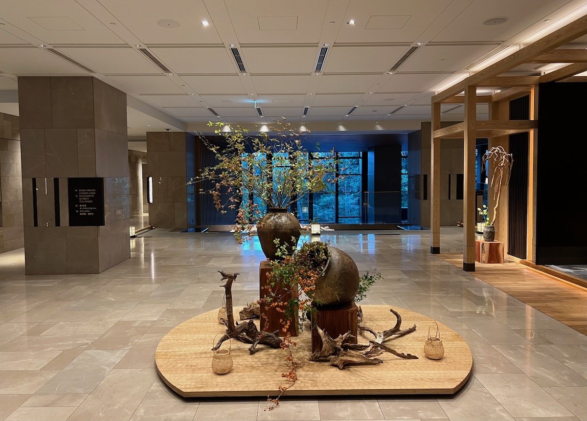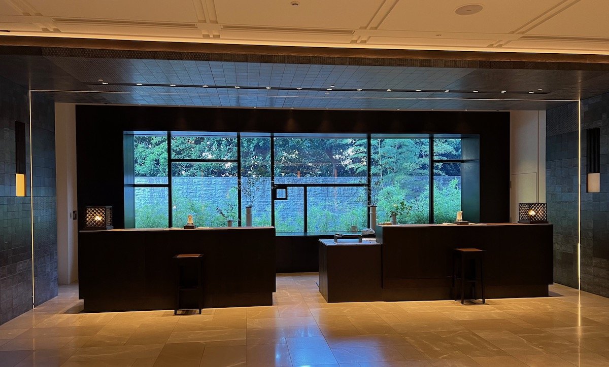 The Four Seasons Kyoto has an interesting layout, as it’s spread out over six floors, spanning from level B2 (basement level two) to level four. The lobby is located on level three, so it’s on the second highest floor. The lobby feels quite grand, as it looks out over the hotel’s restaurant, which can be accessed by walking down a staircase. There are floor-to-ceiling windows spanning three floors, giving you a beautiful view of the nature.
