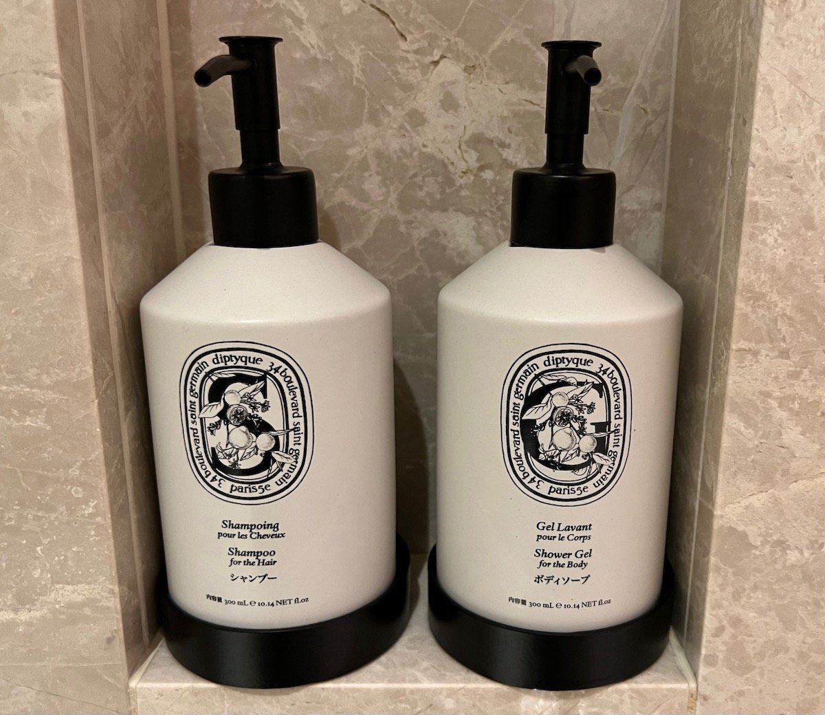 Toiletries in the bathroom were in reusable containers, from Diptyque.