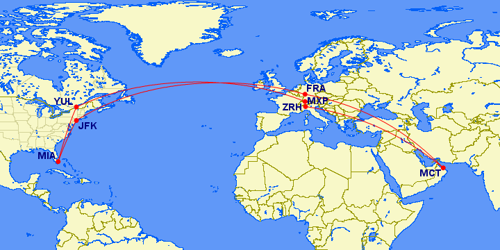 1/12 WY144 Milan to Muscat departing 9:30PM arriving 6:45AM (+1 day)