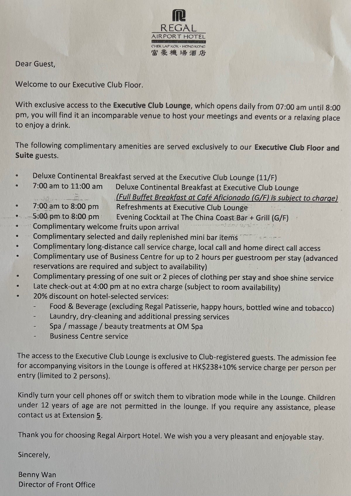 Unfortunately like many hotels around the world post-COVID, the executive club lounge at the Regal Airport Hotel Hong Kong hasn’t fully reopened. As an eligible guest, you receive the following perks: