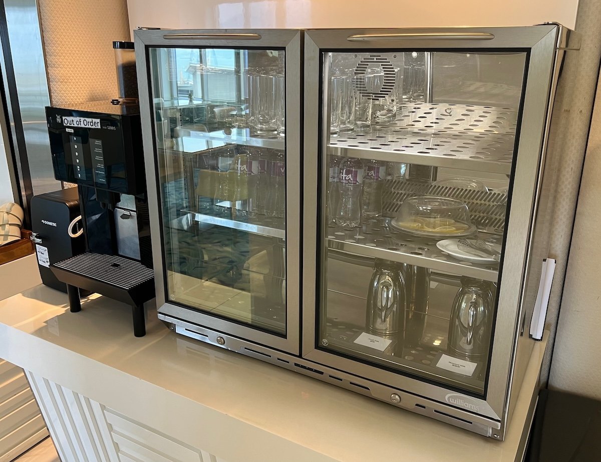 One of the privileges of being in an executive club room is a complimentary minibar. The minibar had eight beverage cans, including Coke, 7-Up, and SKOL beer.