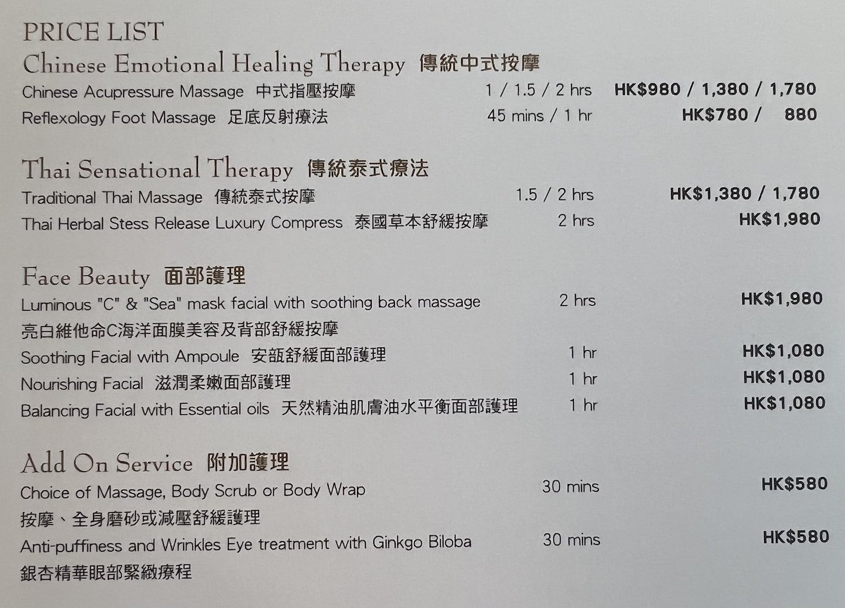 While I didn’t get any spa treatments or check out the facilities, you can find the spa menu below.