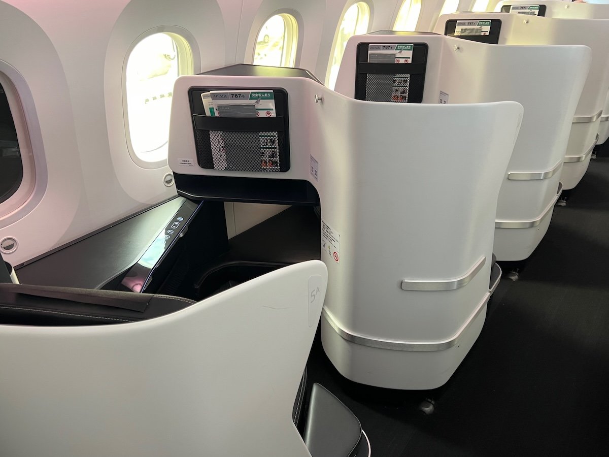 Without a doubt the strangest aspect of ZIPAIR’s full flat seats is that there’s no seat back television. The airline only has streaming entertainment and Wi-Fi, so I believe this is the world’s first reverse herringbone seat without an entertainment screen. The airline instead put the literature pocket in place of the screen, so you get to look at the safety card and an air sickness bag the entire flight.