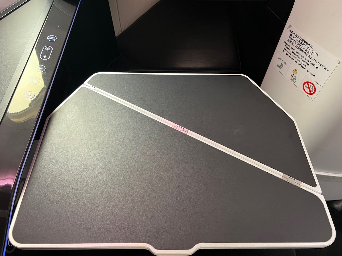 The tray table extends from the console to the side of the seat, and can be flipped over in half.