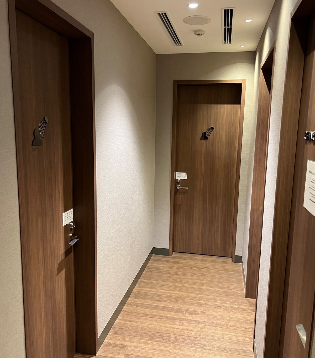 The TIAT Lounge Haneda Airport bathrooms are located off a corridor in the back left of the lounge.